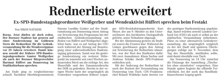 Sehr geehrte Frau Oberbürgermeisterin Lüdtke, sehr geehrter Herr Landrat Dr. Gey, sehr geehrte freigewählte Volksvertreter aus dem Bundestag, dem Landtag und dem Stadtrat von Borna. Liebe