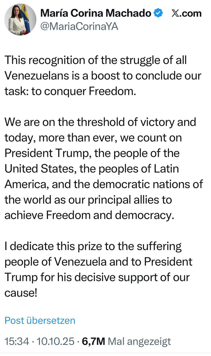 Die Friedensnobelpreisträgerin 2025 María Corina Machado sieht das so: